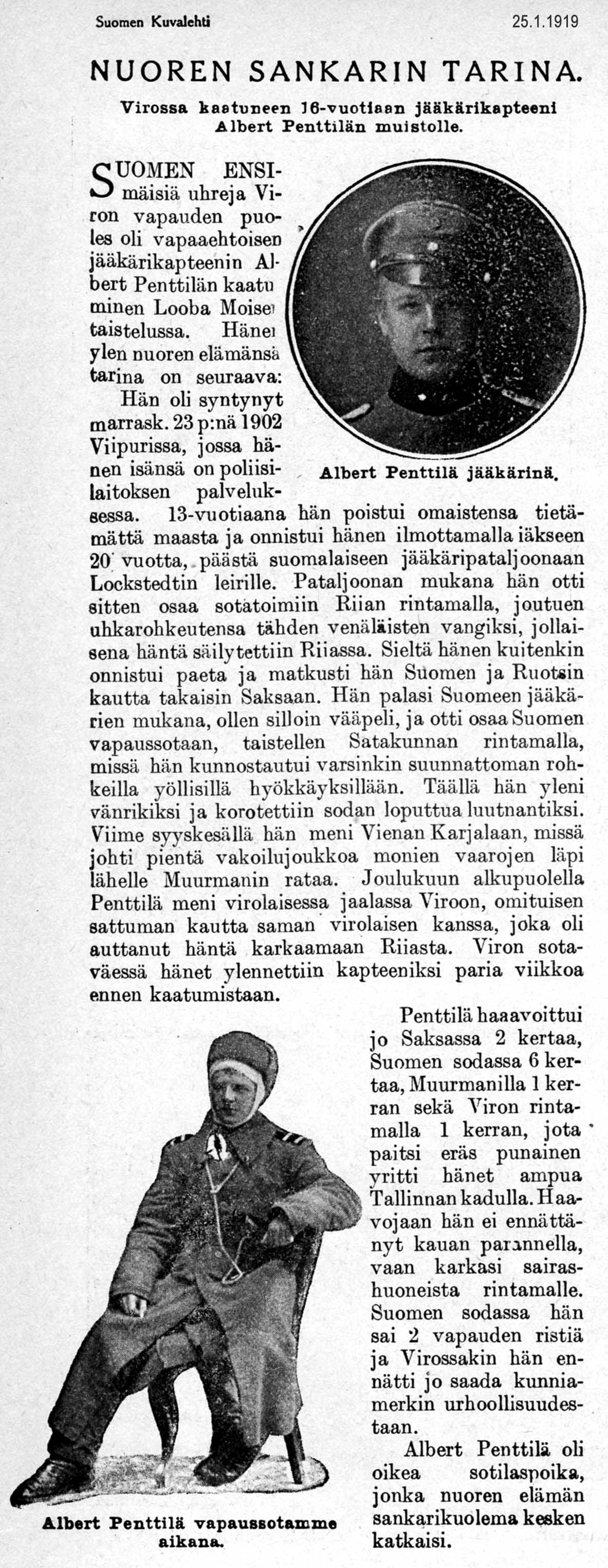 Suomen Kuvalehti julkaisi tammikuussa 1919 nuoren Albert Penttilän muistokirjoituksen. Pian tuli kuitenkin kertoa miehen uusista, eloisista seikkailuista Viron vapaussodassa.