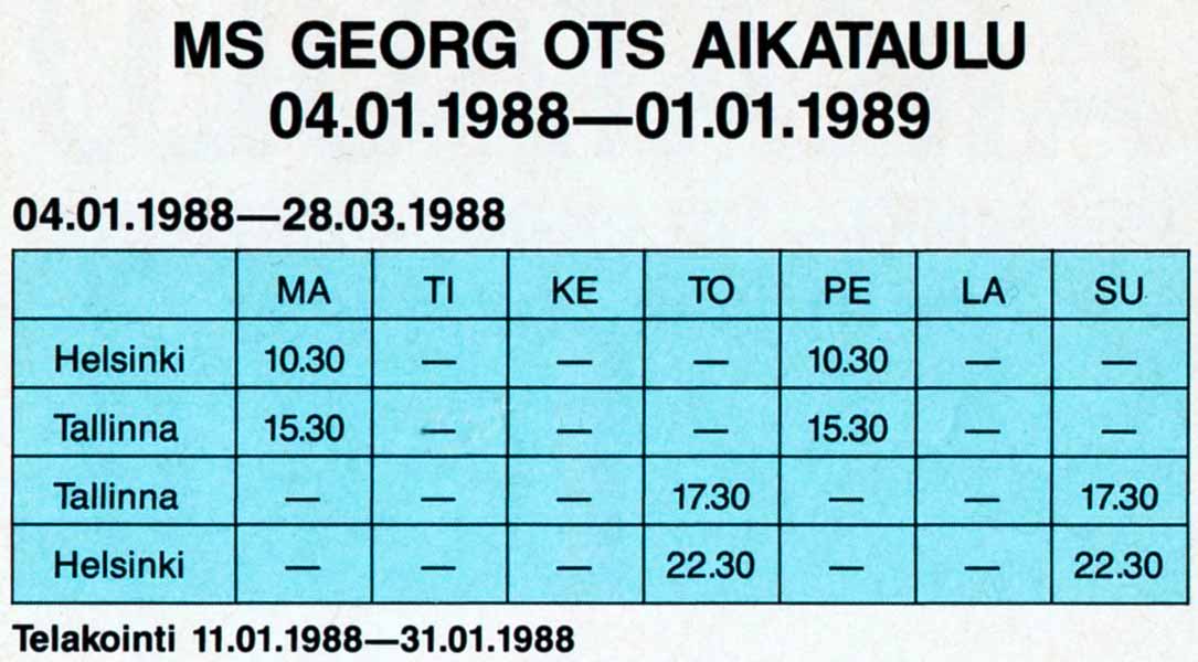 ”Uusi matkustajalaiva oli yksi lukuisista olympiaregatan (1980) lahjoista Tallinnalle. Sitä edelsi Leningradin telakan rakentama Tallinn-laiva. Se oli profiililtaan kaunis, kuten 1960-luvulla oli vielä tapana. Neuvostoliiton puolalaisilta tilaama laivaseitsikko, johon Georg Ots kuului, muistutti rungoltaan silitysrautaa, mutta se oli tiloiltaan ja tekniikaltaan jo toista universumia.