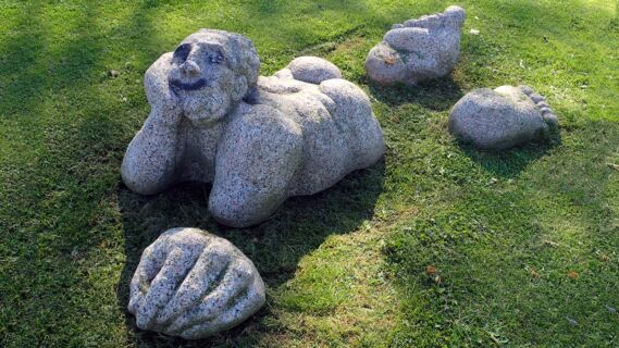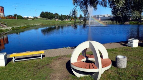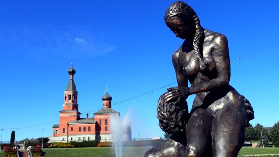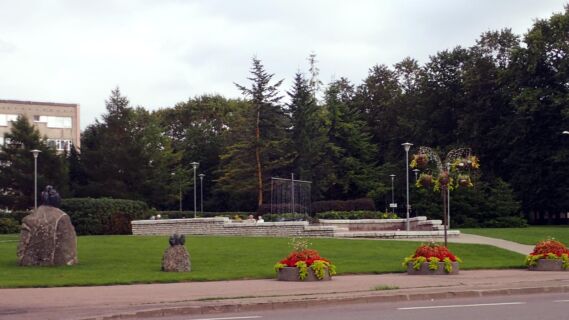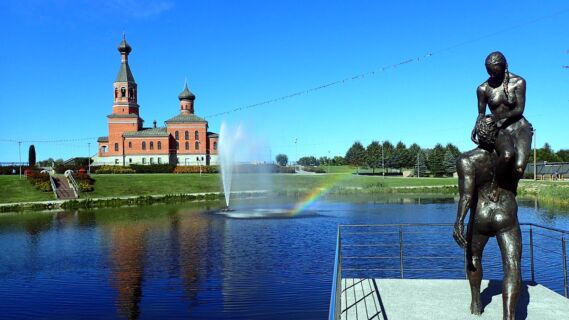 Pronssimies kohottaa rakastettuaan lammen rannalla. Sen keskellä suihkulähteen pisarat taittuvat sateenkaareksi. Taustalla nousee arkkienkeli Mikaelille pyhitetty kirkko, jonka sipulit peilautuvat veden pinnassa. Lammen ympärillä on kukka-asetelmia, omintakeisia istuimia ja ympäristötaidetta.