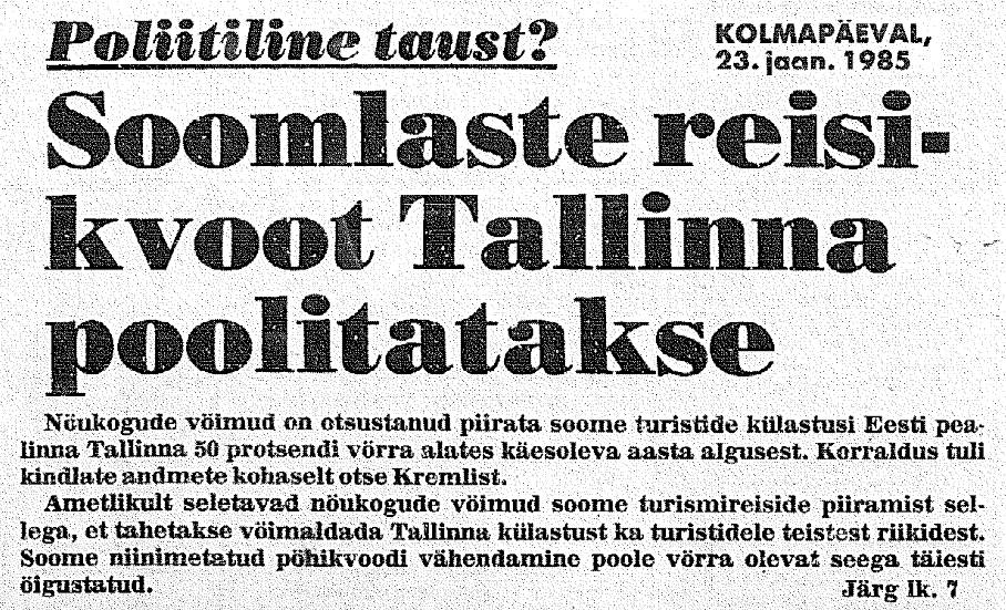 - Poliitiline taust? Soomlaste reisikvoot Tallinna poolitatakse. Eesti Päevaleht 23.1.1985
