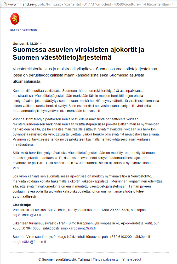 ERR haastatteli myös molempien maiden ajokorttiviranomaisia. Soitto Suomen Trafiin paljasti ongelman lähteeksi väestötietojärjestelmän, jonka merkintöjä poliisi ajokortin myöntäjänä ei voi oikaista. Yksikonpäällikkö Simo Karppinen ymmärsi aiheutuneen mielipahan ja oikaisutarpeen: