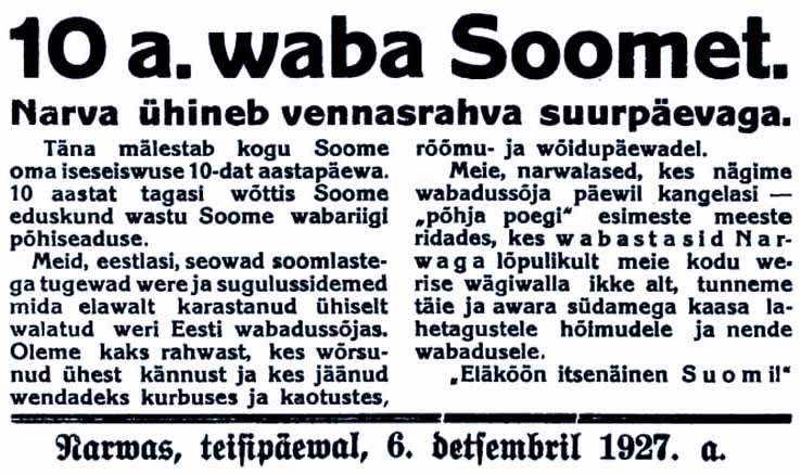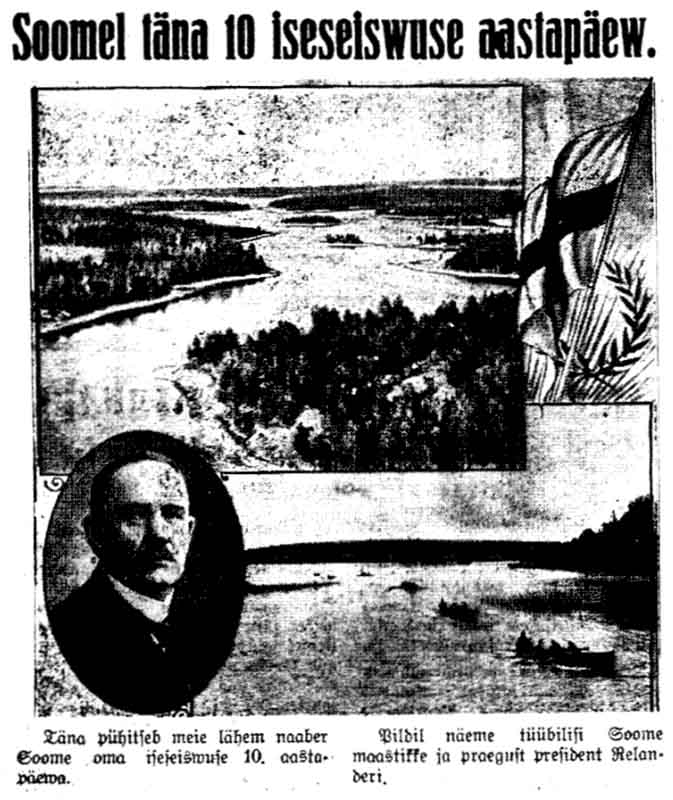 Koko sivun Suomen kymmenvuotiselle itsenäisyydelle on omistanut kolme Tallinnassa toimitettavaa sanomalehteä: Maa, Päevaleht ja Vaba Maa. Etusivulleen juhlapäivän nostaa kuitenkin vain Narvan kaupungissa ilmestyvä Põhja Kodu, joka otsikoi ”10 vuotta vapaata Suomea” ja kirjoittaa: