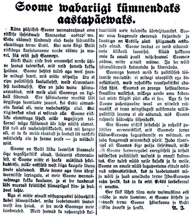 Sosialidemokraattinen Rahva Sõna juhlistaa Suomen itsenäisyyspäivää valokuvilla tyypillisestä suomalaisesta maastosta ja nykyisestä presidentistä Lauri Kristian Relanderista. Hänen kuvallaan artikkelinsa on somistanut myös Maamiesliittojen äänenkannattaja Kaja. Lehti painottaa Suomen itsenäisyyden kivuliasta alkua ja palauttaa mieleen Viron vapaussodassa saaman avun: